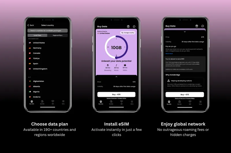 Instabridge offers a range of local, regional, and global eSIM plans designed to keep you connected during your travels. Instabridge plans provide data packages ranging from 1 GB to 20 GB, with durations from 7 to 30 days. The prices start as low as $2.50 for popular options like eSIM for Canada, France, and others.